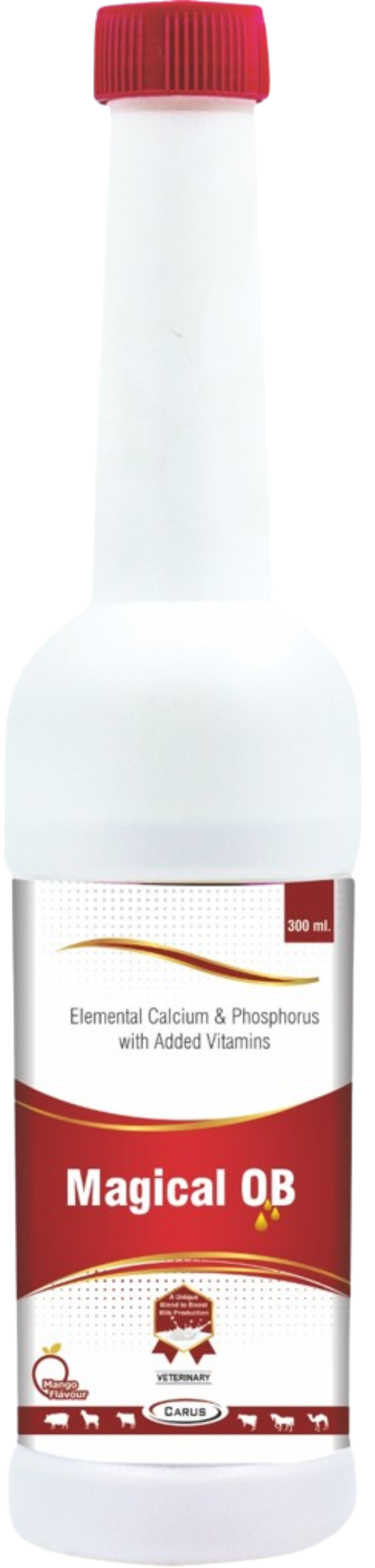 Magical OB is a mango-flavored weekly calcium gel supplement for livestock, formulated to enhance milk production, reduce lactation stress, and support udder health. Each 300 mL dose delivers elemental calcium, phosphorus, essential vitamins, and herbal extracts to maintain peak milk persistency and strong bones.